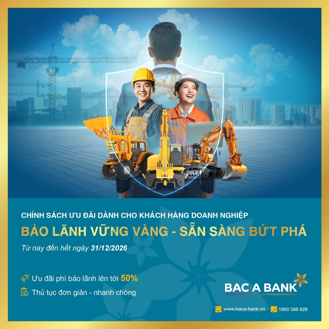 Nhằm tháo gỡ những vướng mắc, đồng hành cùng khách hàng doanh nghiệp ngay từ những ngày đầu năm 2026, Ngân hàng TMCP Bắc Á (BAC A BANK) chính thức triển khai chương trình ưu đãi “Bảo lãnh vững vàng – Sẵn sàng bứt phá”, với kỳ vọng mang đến giải pháp tài chính toàn diện, hiệu quả và linh hoạt, đồng hành cùng khách hàng doanh nghiệp xây dựng nền tảng tài chính vững chắc, tự tin nắm bắt và hiện thực hóa các cơ hội trong năm 2026 và những năm tiếp theo.