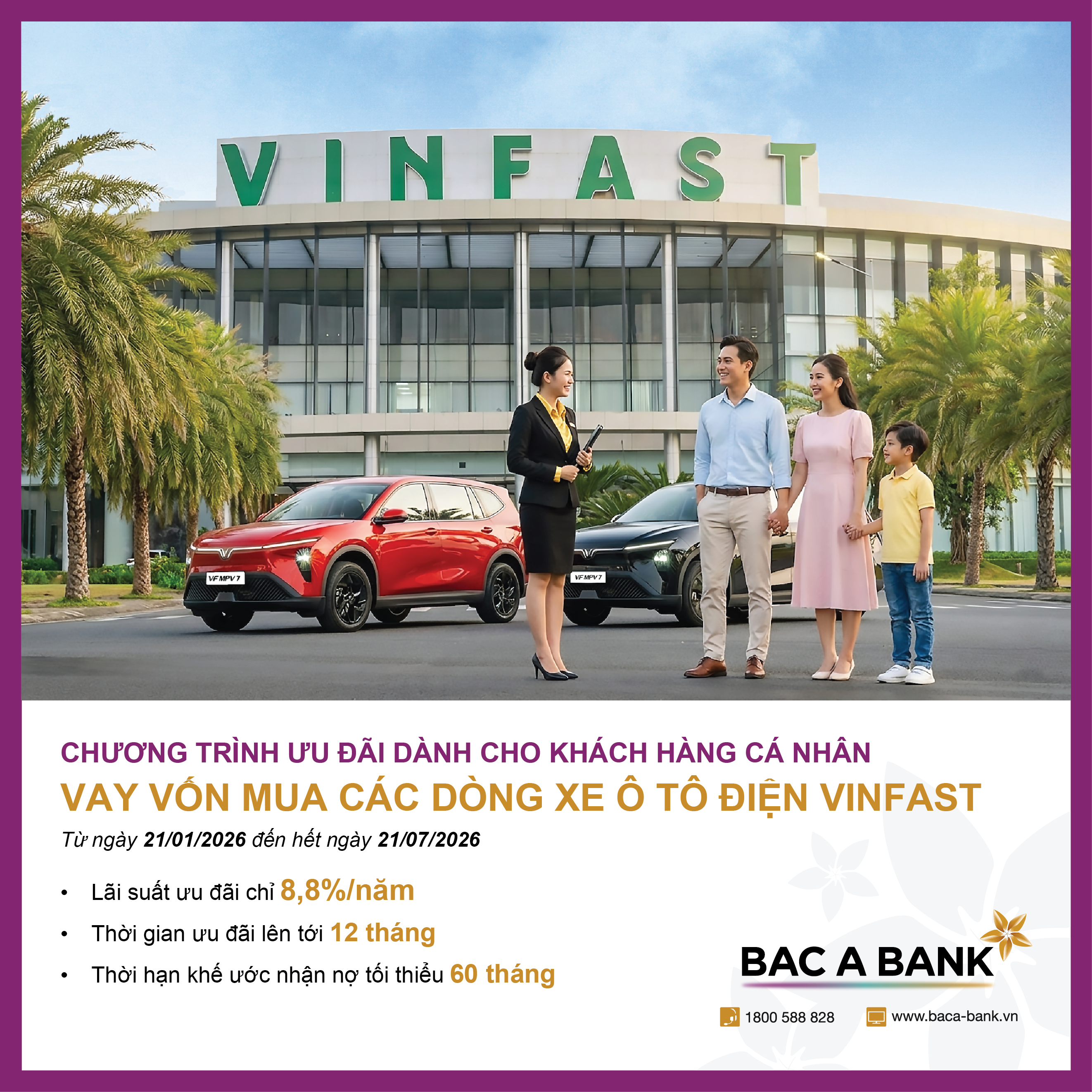 Đáp lại sự hưởng ứng tích cực của đông đảo Khách hàng trong suốt thời gian qua, Ngân hàng TMCP Bắc Á (BAC A BANK) tiếp tục triển khai Chương trình ưu đãi vay mua các dòng xe ô tô điện VinFast – mở rộng cơ hội sở hữu phương tiện hiện đại với chi phí vay hợp lý và thủ tục nhanh gọn. Thông qua các ưu đãi hấp dẫn ngay đầu năm 2026 này, Chương trình một lần nữa khẳng định cam kết đồng hành của BAC A BANK trong xu hướng sử dụng phương tiện thân thiện với môi trường và hướng tới lối sống xanh, bền vững.
