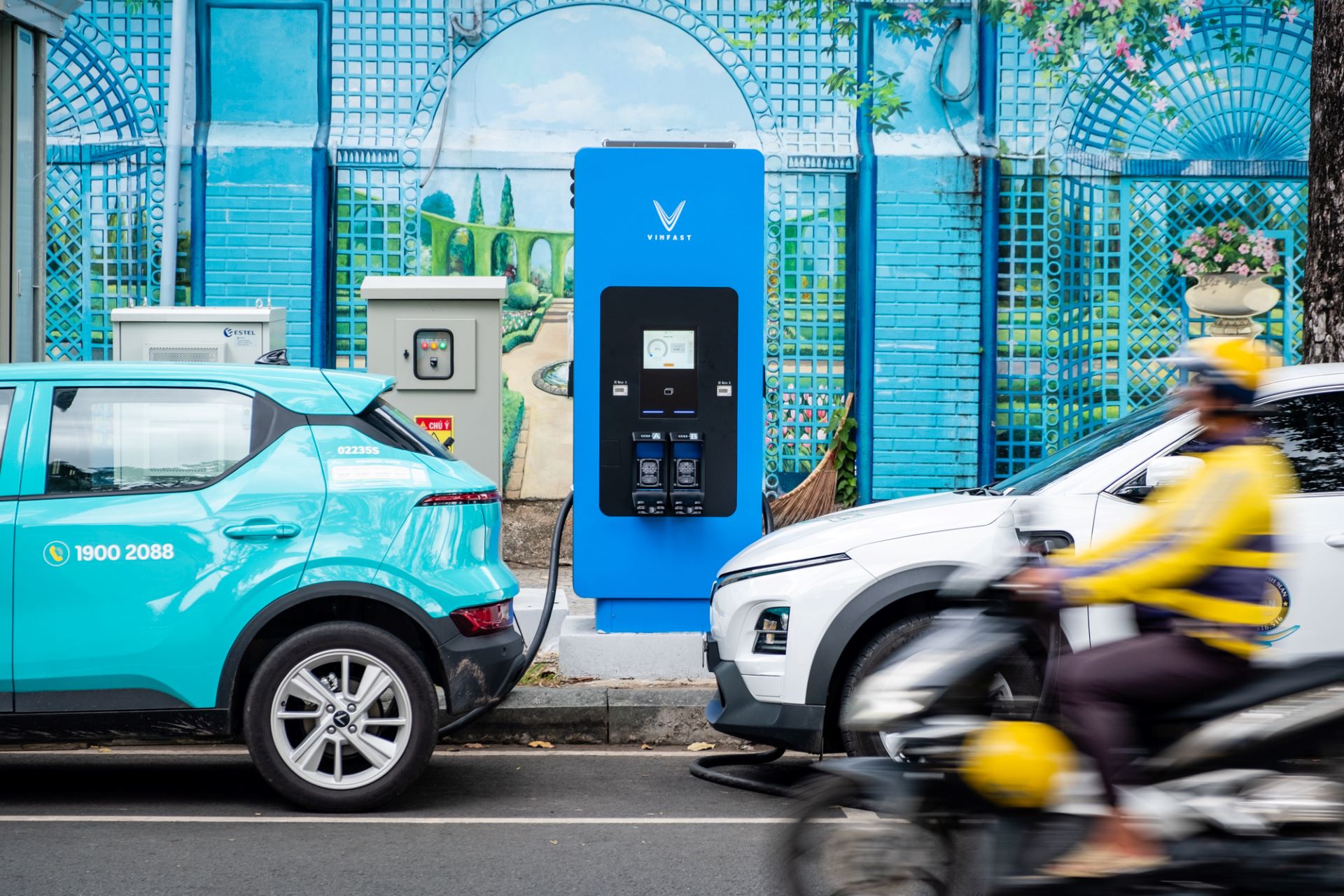 Trạm sạc V-Green mới trên đường Huyền Trân Công Chúa (TP.HCM) mang đến sự tiện lợi cho các chủ xe, tài xế xe điện VinFast khi có thể sạc trong lúc đỗ xe bên lề đường.